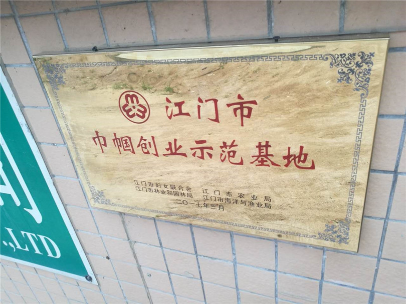 A leader of the municipal Women's Federation awarded the certificate of "Demonstration Base of Women's Entrepreneurship of Jiangmen City" to the president Zhuang Run’ai.
